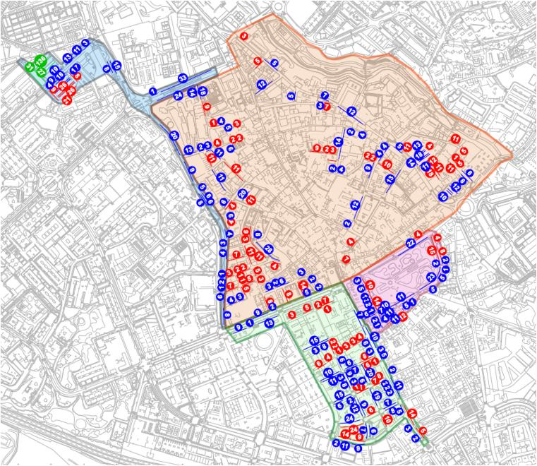 - Zona roja (preferente residentes). Dentro del horario de regulación de la vía pública, la zona roja es de uso preferente para los residentes con distintivo de la zona de su residencia.