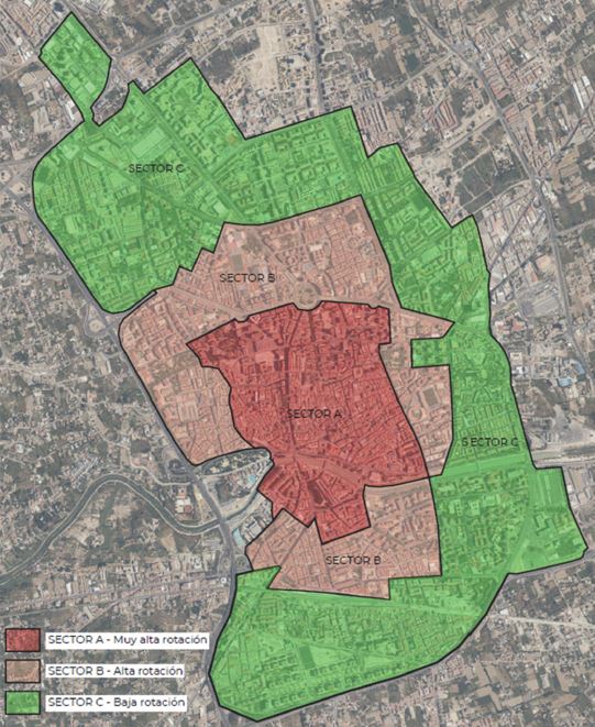 La zona azul, verde y naranja en Murcia